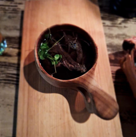 U meniju je bilo još nečega čega nije bilo u menijima drugih restorana – medved! Nismo hteli da propustimo priliku da ga probamo. Servirali su nam ga prodinstanog u malo bujona, u tradicionalnoj, drvenoj kuksa šolji.
